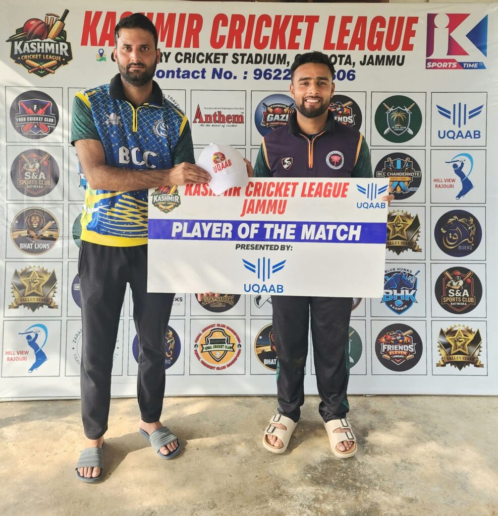In reply, the Bhat Lions Kupwara fought well but fell 7 runs short front the target, they scored 176 runs for the loss of 8 wickets in the allotted 19 overs.Javid Jadu took 4 wickets and Adil Kachur took two for BCC. Javid Jadu was declared player of the match for his match winning bowling spell in which he took four wickets.
